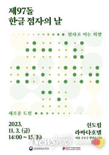 뉴스펀치 김희경 기자 | 문화체육관광부는 한국시각장애인연합회(회장 김영일)와 함께 11월 3일 오후 2시에 라마다서울신도림 호텔에서 ‘제97돌 한글 점자의 날’ 기념식을 개최한다.