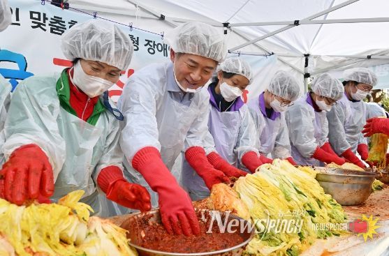 뉴스펀치 조은별 기자 | 광주광역시 서구가 ‘제30회 광주김치축제’ 현장에서 장애인들과 특별한 행사를 진행했다. 김이강 서구청장은 3일 오전 김치축제 개막식에 참석한 후 ‘서구형 장애인 일자리 사업’에 참여하고 있는 중증장애인 근로자 15명, 서구새마을부녀회 자원봉사자들과 함께 김장김치 200포기를 담가 어려운 이웃들에게 전달했다.