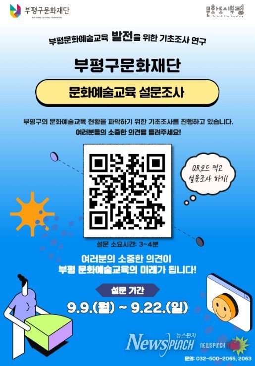 뉴스펀치 탁상훈 기자 | 부평구 문화재단이 ‘부평문화예술교육 발전 기초조사 연구’를 위해 부평 거주 및 생활권 시민을 대상으로 온라인 설문조사를 진행한다고 6일 밝혔다.