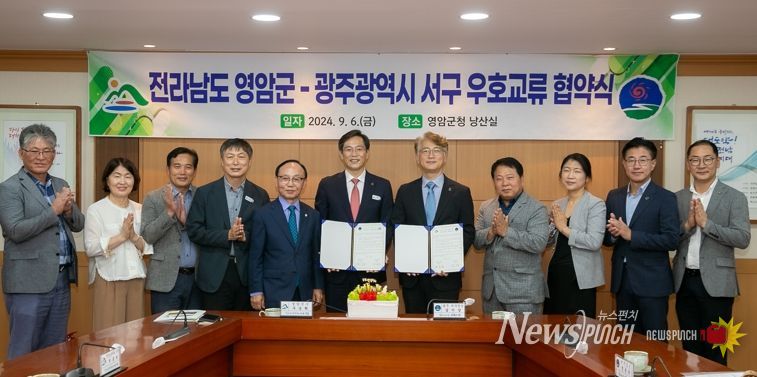뉴스펀치 김길룡 기자 | ‘더 큰 영암’을 표방하는 전남 영암군이, 6일 군청에서 ‘우뚝 서구’의 광주광역시 서구와 문화·관광·예술·체육·경제·교육·행정 전반의 상호교류와 상생발전을 도모하는 우호교류 협약을 체결했다.