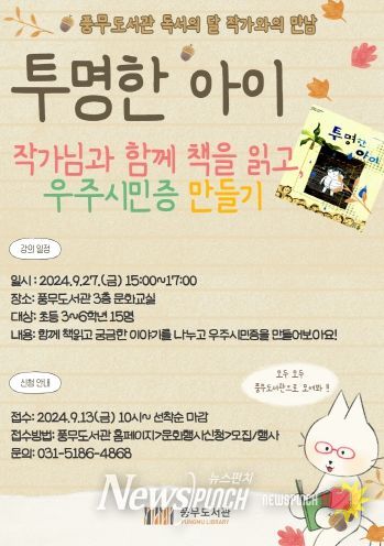 뉴스펀치 탁상훈 기자 | 김포시 풍무도서관은 2024년 독서의 달을 기념하여 9월 27일 금요일 오후 3시부터 5시까지 풍무도서관 3층 문화교실에서 안미란 작가를 초청하여 작가와의 만남 ‘투명한 아이’를 운영한다.
