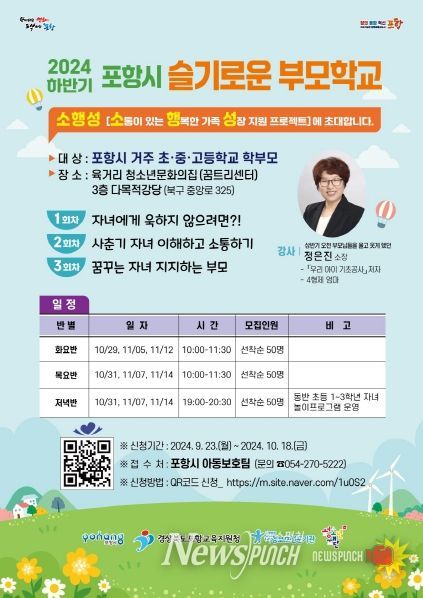 뉴스펀치 김종율 기자 | 포항시가 오는 10월 11일부터 아동학대예방과 긍정양육 확산을 위한 하반기 ‘슬기로운 부모학교’를 청소년 문화의집 꿈트리센터 다목적 강당에서 운영한다.