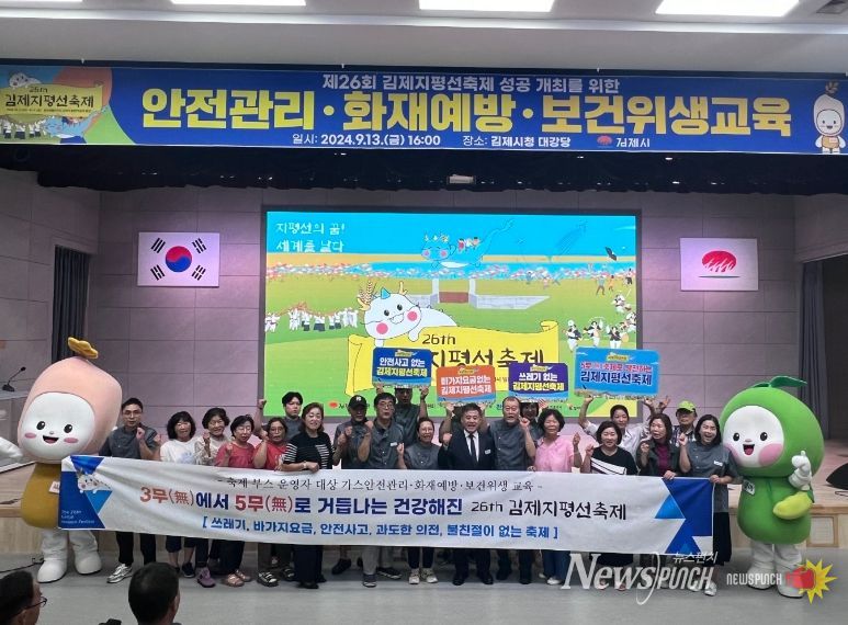 또한 지난 13일 부스 운영자를 대상으로 가스안전관리ㆍ화재예방ㆍ보건위생 교육을 진행했다. 그리고 교육과 함께 제26회 김제지평선축제가 성공적인 5無 축제가 될 수 있도록 일회용품 사용과 쓰레기 발생을 최소화할 것, 음식 가격과 체험비 등 각종 비용을 합리적으로 책정할 것, 교육받은 안전 관련 내용을 숙지하고 실천할 것, 방문객들을 친절히 응대할 것을 함께 선서하며 다짐하는 시간을 가졌다.