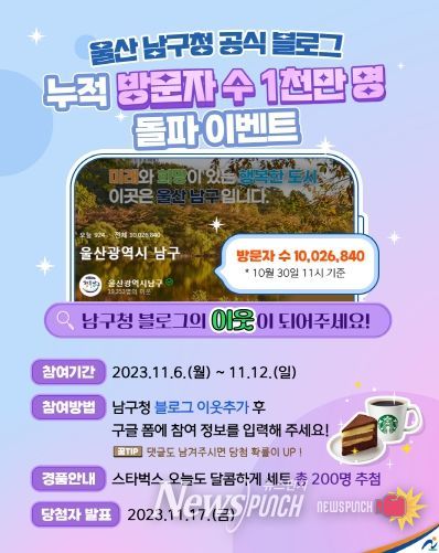 남구는 이를 기념해 오는 12일까지 ‘블로그 누적 방문자 천만돌파 감사 이벤트’를 실시한다.