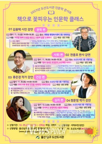 뉴스펀치 임정용 기자 | 남구 도산도서관은 인문학 콘서트 ‘책으로 꽃피우는 인문학 클래스’프로그램을 오는 10일부터 12월 2일까지 총 4회에 걸쳐 운영한다고 밝혔다.
