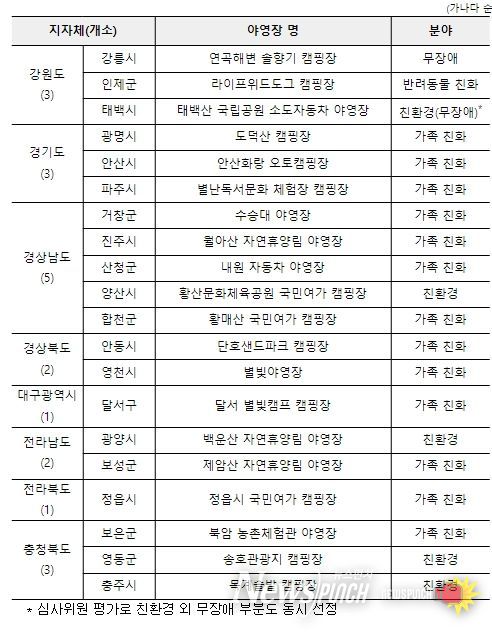 분야별 대표 선정사례를 보면 ▴가족 친화 야영장으로는 목공체험, 어린이 도서관 프로그램 등을 운영하고 있는 ‘진주 월아산 자연휴양림 야영장’이 선정됐다. ▴무장애 야영장으로는 강원도 강릉의 ‘연곡해변 솔향기 캠핑장’이 선정됐는데, 이곳은 장애인이 이용할 수 있는 데크가 설치되어 있고, 장애인 우선 예약제도를 운영하는 등 장애인이 편리하게 이용할 수 있는 시설을 구비하고 있다. ▴반려동물 친화 야영장으로는 반려견 산책로와 수영장, 체육관 등 우수한 반려동물 특화 부대시설을 보유한 ‘라이프위드도그 캠핑장’이 선정됐다. ▴친환경 야영장으로는 산림치유 프로그램 등을 운영하고 캠핑카 오폐수 처리시설인 덤프스테이션을 갖추고 있는 ‘백운산 자연휴양림 야영장’이 선정됐다.