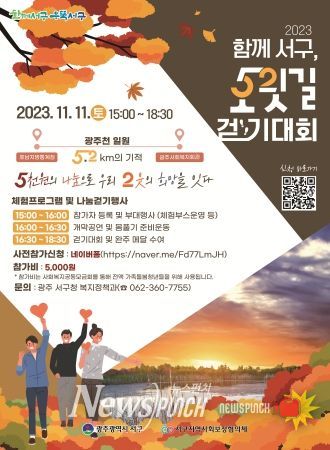 뉴스펀치 조은별 기자 | 광주광역시 서구는 주민의 관심과 ‘발걸음’으로 가족돌봄청년에게 희망을 주고 행복한 삶을 지원하기 위해 ‘함께 서구, 오~! 잇길 걷기대회’를 오는 11일 오후 3시 광주천 일대에서 개최한다.