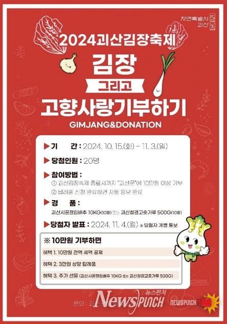 뉴스펀치 김길룡 기자 | 충북 괴산군이 11월 1일부터 3일까지 열리는 ‘괴산김장축제’를 기념해 고향사랑기부제 이벤트를 진행한다.