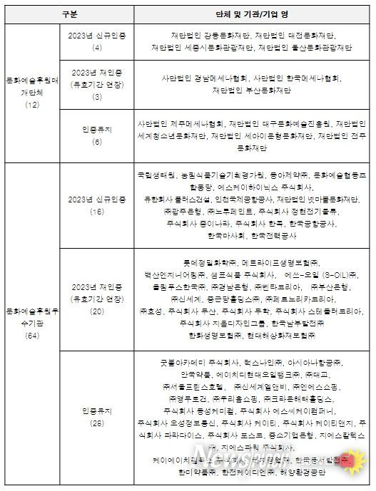 ‘문화예술후원 매개단체 및 우수기관 인증제도’는 매년 모범적으로 문화예술 분야를 후원하고 있는 단체와 기관을 심사해 인증하는 제도다. 법률이 시행된 2014년부터 현재까지 총 76곳이 인증 혜택을 받았다. 올해는 신규 인증 20곳, 재인증 23곳을 선정했다.