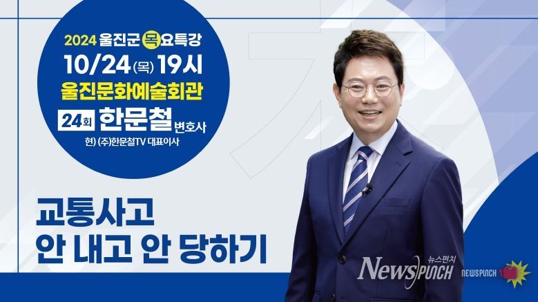 뉴스펀치 김종율 기자 | 울진군은 오는 24일 울진문화예술회관(후포면)에서 한문철 변호사를 초청하여‘교통사고 안 내고 안 당하기’라는 주제로 제24회 목요특강을 개최한다.