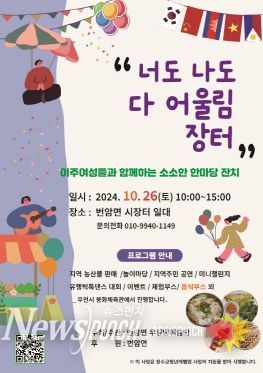 번암우당탕예술단이 주관하는 ‘너도나도 다어울림 장터’는 26일 번암면 시동강 천변공원에서 개최되며 이주 여성들이 준비한 다양한 세계 음식을 포함해 여러 체험 프로그램과 공연이 진행된다. 지역주민들과 이주 여성들이 함께 마련할 이번 행사는 번암면의 특색을 알리고 서로 다른 문화를 존중하고 공감하는 화합의 장으로 꾸미고자 한다.