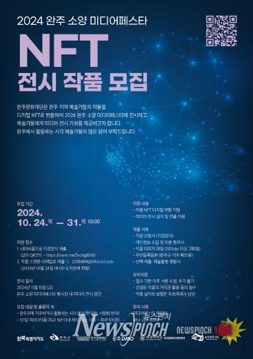 뉴스펀치 유동국 기자 | 완주문화재단(이사장 유희태)은 이달 말까지 소양 미디어아트 페스타 NFT 기회전에 참여할 작가를 모집한다고 밝혔다.