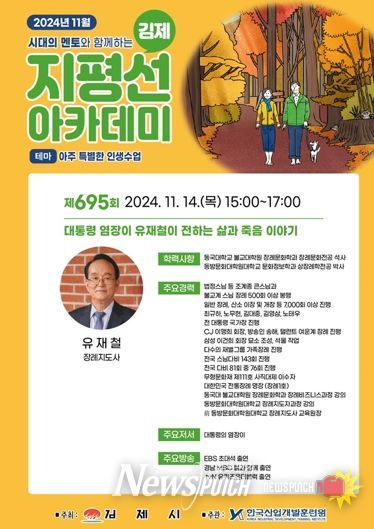 뉴스펀치 유동국 기자 | 김제시는 오는 14일 제695회 지평선아카데미에 유재철 장례지도사를 초청해 “대통령 염장이 유재철이 전하는 삶과 죽음이야기”라는 주제로 강연을 진행한다고 밝혔다.