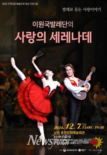한편 이원국발레단은 대한민국 최고의 발레리노 이원국 단장을 중심으로 정상의 무용수들로 구성된 민간 직업발레단으로, 발레단은 남원 춘향문화예술회관에서 오는 12월 7일 ‘사랑의 세레나데’ 2회 공연을 시작으로 27일, 28일에는 해설과 함께 즐기는 겨울 고전 ‘호두까기 인형’을 선보인다.