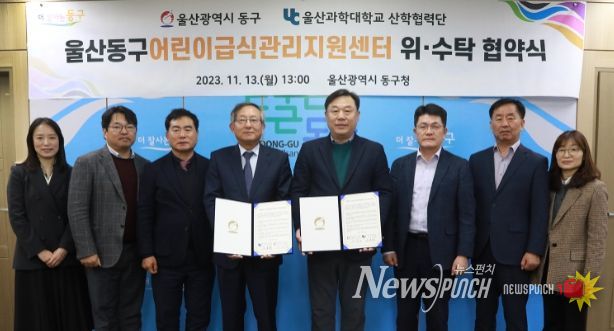뉴스펀치 임정용 기자 | 울산시 동구청이 11월 13일 오후 1시 동구청 2층 구청장실에서 울산과학대학교와 어린이급식관리지원센터 운영 위탁협약을 체결했다.