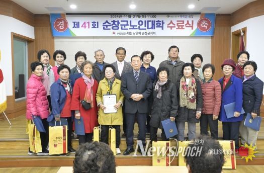 뉴스펀치 유동국 기자 | (사)대한노인회 순창군지회는 21일 노인회관에서 강병문 노인대학장과 노인대학생 200여명이 참석한 가운데 제41기 순창군 노인대학 수료식을 가졌다.