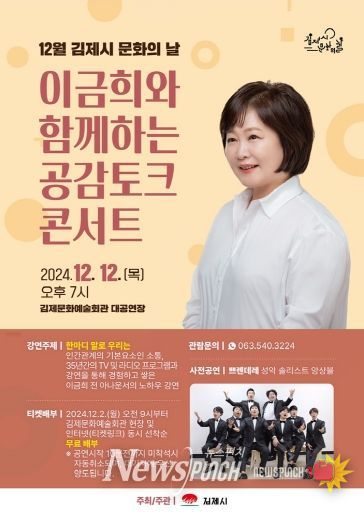 뉴스펀치 유동국 기자 | 김제시가 오는 12월 12일 오후 7시 김제문화예술회관 대공연장에서‘이금희와 함께하는 공감 토크콘서트’를 개최한다.