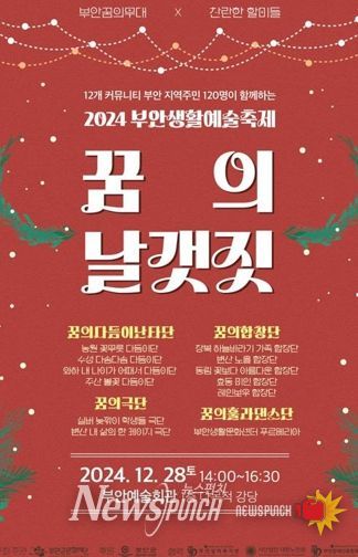 뉴스펀치 유동국 기자 | 부안군 12개 마을 총 120명이 참여하는 '생활예술공동체 꿈의무대 꿈의 날갯짓' 축제가 2024년 12월 28일 14시부터 부안예술회관 1층 다목적 강당에서 진행된다.