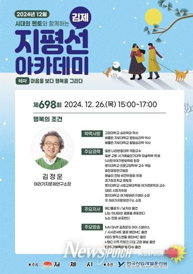 한편, 지평선아카데미는 시민 누구나 무료로 별도 신청 없이 선착순으로 참석 가능하며, 현장 참여가 어려운 시민을 위해 강연 영상이 김제시 홈페이지와 사이버학습센터에 업로드된다.