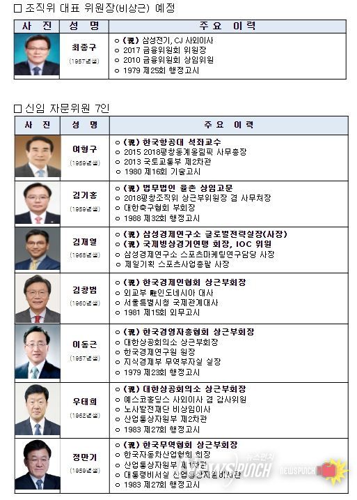 아울러 ▴김재열 국제올림픽위원회(IOC) 위원 겸 삼성경제연구소 글로벌전략실장, ▴여형구 전(前) 2018 평창 동계올림픽 조직위원회 사무총장, ▴김기홍 전(前) 2018 평창 동계올림픽조직위원회 사무처장, ▴한국경제인협회 김창범 상근부회장, ▴한국경영자총협회 이동근 상근부회장, ▴대한상공회의소 우태희 상근부회장 ▴한국무역협회 정만기 상근부회장 등 총 7명이 새롭게 자문위원으로 위촉됐다. 국내 주요 경제단체 부회장을 자문위원으로 위촉함으로써 경제계의 관심과 참여를 촉구해 신임 대표 조직위원장과 함께 대회 성공의 기반을 탄탄히 다질 것으로 예상된다.