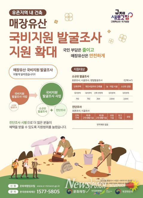 문화재청은 일정 규모 이하의 건설공사 시 매장유산 조사를 국가가 지원하여 경제적 부담을 줄이고 매장유산을 효과적으로 보호·관리하기 위해 ‘국비지원 발굴조사 사업’을 시행해오고 있으며, 단독주택, 농어업시설 등 소규모 건설공사에 한해 발굴조사 비용을 지원하던 것을 확대시켜 올해부터는 제1·2종 근린생활시설과 운동시설 같은 생활밀접형 건설공사에 대해서는 면적에 상관없이 진단조사(표본·시굴) 비용을 전액지원해오고 있다.