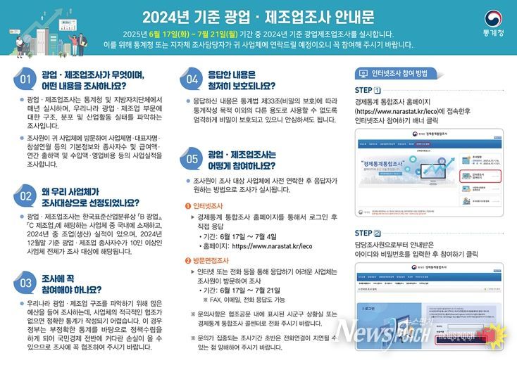 특히, 이번 조사에서는 전국사업체조사 결과와 행정자료 등을 적극 활용해 조사의 효율성을 높이는 한편, 사업체의 응답 편의를 위해 인터넷, 이메일, 팩스 전화 등 다양한 비대면 방식도 병행 실시할 계획이다.