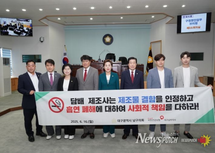 뉴스펀치 조평훈 기자 | 대구광역시 남구의회는 6월 16일 제295회 정례회 제2차 본회의에서 담배 제조사의 제조물 결함을 인정하고 사회적 책임을 다할 것을 촉구하는 결의안을 성윤희 의원이 대표 발의하고 전체의원의 동의로 채택했다.