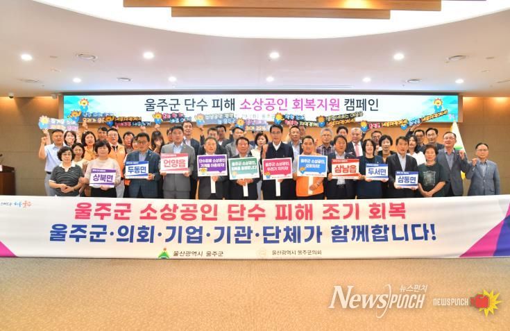 뉴스펀치 김길룡 기자 | 울산 울주군이 29일 군청 문수홀에서 이순걸 군수와 울주군의회 최길영 의장 및 군의원, 소상공인연합회, 외식업지부, 관내 기업 관계자 및 지역 사회단체장 등 40여명이 참석한 가운데 ‘단수 피해 소상공인 회복지원 캠페인’을 개최했다.
