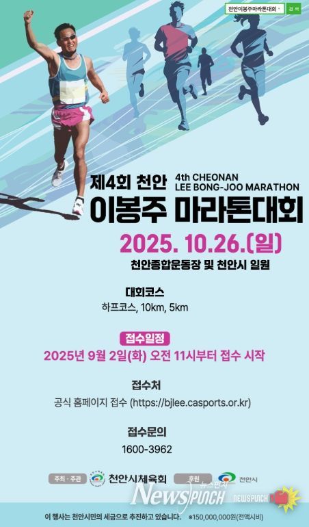 뉴스펀치 김길룡 기자 | 천안시체육회는 ‘제4회 천안이봉주마라톤대회’ 참가자를 다음 달 2일부터 선착순 모집한다고 25일 밝혔다.