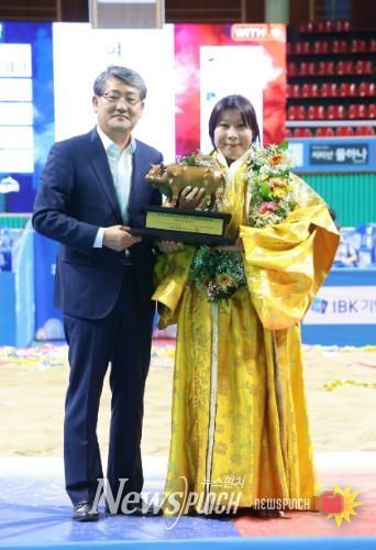 김다영 선수는 지난해 같은 대회 8강에서 탈락했으나, 올해 결승에서 충북 영동군청 소속 양윤서(국화급) 선수를 꺾고 생애 첫 천하장사 타이틀을 거머쥐었다.