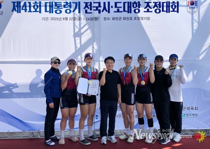 유은경 감독이 이끄는 군산시청 조정팀은 지난 22일부터 24일까지 강원도 화천군 화천호 조정경기장에서 열린 ‘제41회 대통령기 전국시·도대항조정대회’ 여대 및 일반부 쿼드러플스컬과 싱글스컬에 출전해 금메달을 획득했다.