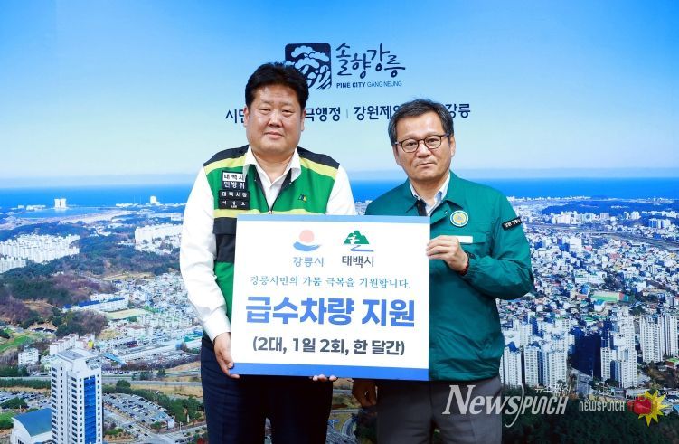 이상호 태백시장은 26일 강릉시청에서 김홍규 강릉시장과 급수차 지원 전달식을 갖고, 한 달간 급수차 2대를 매일 2회 강릉시에 파견해 급수 지원을 실시한다고 밝혔다.