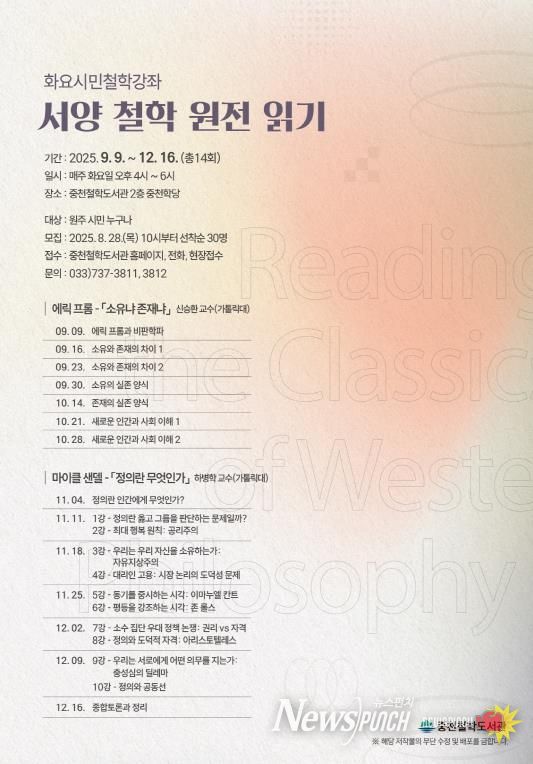 뉴스펀치 김보성 기자 | 원주시 중천철학도서관은 오는 9월 9일부터 12월 16일까지 매주 화요일 오후 4시 '하반기 화요시민철학강좌'를 운영한다. 강좌는 가톨릭대학교 신승환 교수와 하병학 교수를 초빙하여, 서양 철학의 원전을 함께 읽고 토론하는 방식으로 진행된다.