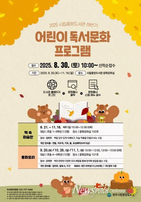 뉴스펀치 김보성 기자 | 원주시립중앙도서관은 오는 9월부터 관내 초등학생들을 대상으로 하반기 어린이 독서문화 프로그램을 운영한다.