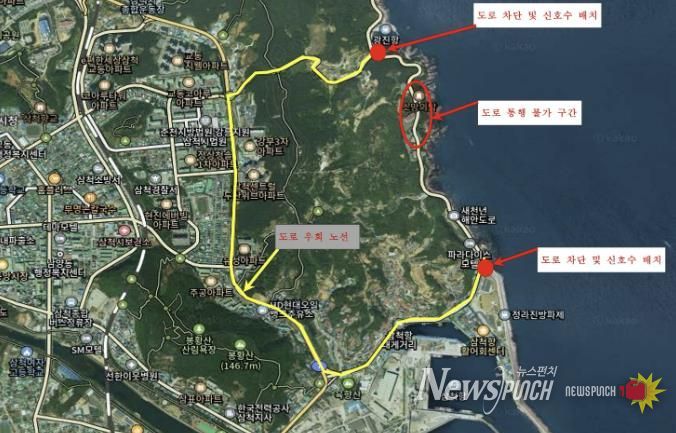 뉴스펀치 김보성 기자 | 삼척시는 새천년 해안도로 썬라이즈 명소화사업을 위해 9월 3일 새벽 시간대인 오전 0시부터 오전 8시까지 작업 구간 차량 전면 통제를 시행한다고 밝혔다.