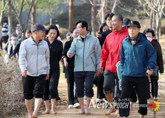 의견 청취 후 박병규 청장과 참여 주민들은 함께 첨단아미둘레길 맨발길을 걸어보는 시간을 가졌다. 첫 소통마당을 기념해 발자국을 남기는 설정극도 진행했다.