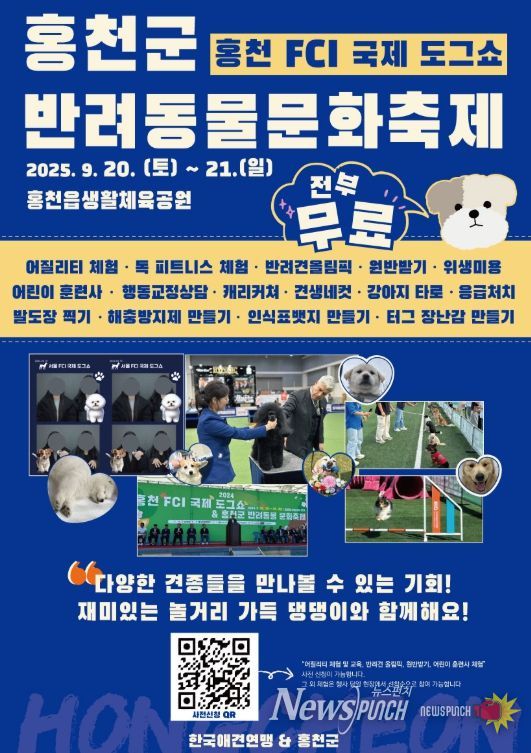 뉴스펀치 김보성 기자 | 홍천군은 오는 9월 20일부터 21일까지 2일간 홍천읍 생활체육공원에서 '2025 홍천 FCI 국제 도그쇼 · 홍천군 반려동물 문화축제'를 개최한다.