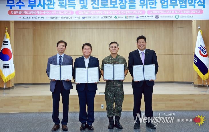 뉴스펀치 김보성 기자 | 태백시는 8일 강원특별자치도교육청에서 해군본부, 강원특별자치도교육청, 한국항공고등학교와 함께 해군 부사관 육성과 학생 진로 보장을 위한 업무협약을 체결했다고 밝혔다.