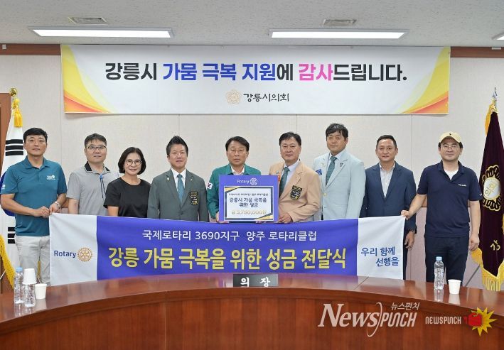 뉴스펀치 김보성 기자 | 양주로터리클럽(회장 일송 박경순)은 8일 강릉시의회를 방문, 강릉시 가뭄 피해 성금 375만원을 기탁하고 가뭄 위기 극복을 기원했다.