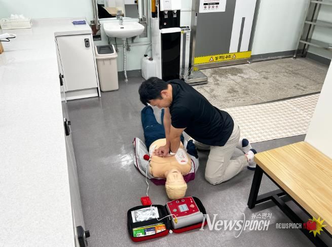 이번 훈련은 이용자가 남자 탈의실 내에서 심정지로 쓰러진 상황을 가정하여 진행됐으며, 실제상황 못지 않은 긴장감 속에서 신속한 초기 대응과 협력 체계를 점검하는 계기가 됐다.
