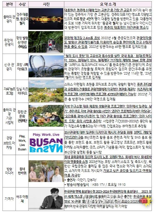 ▴‘올해의 관광지-경주 대릉원&동궁과 월지’, ▴‘무장애 관광지-평창 발왕산 천년주목숲길’, ▴‘신규 관광지-포항 스페이스워크’, ▴‘지속가능 관광프로그램-임실 치즈테마파크’, ▴‘올해의 관광기관·사업체-강진 문화관광재단’, ▴‘관광브랜드·마케팅-플레이, 워크, 리브, 부산(Play, Work, Live, Busan)’, ▴‘방송미디어-동네한바퀴’, ▴‘관광발전 기여자-배우 이정재’