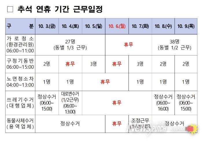 10월 3일부터 9일까지 이어지는 이번 추석 연휴 기간 중 발생되는 적치 쓰레기를 해소하고 청소 관련 민원을 신속하게 처리하기 위하여 동별 청소 인력 배치 및 청소 기동반 운영 등 주민 불편 최소화에 초점을 맞춰 추진된다.