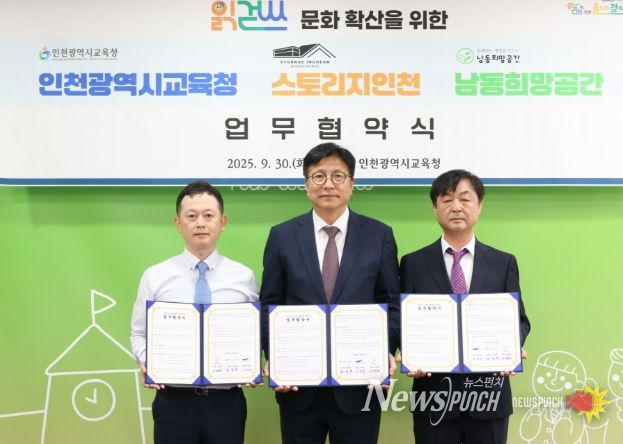 뉴스펀치 탁상훈 기자 | 인천광역시교육청은 9월 30일 ㈜월미하이랜드(대표 이덕성) 스토리지인천, 남동희망공간(대표 유병희)과 함께 ‘읽걷쓰’ 문화 확산을 위한 업무협약을 체결했다.