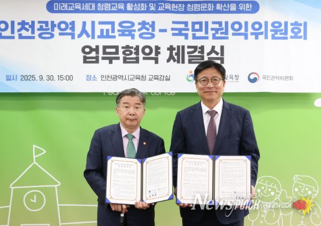 뉴스펀치 탁상훈 기자 | 인천광역시교육청은 9월 30일 국민권익위원회와 청렴한 미래인재 양성과 교육 현장의 청렴 문화 확산을 위한 업무협약을 체결했다.