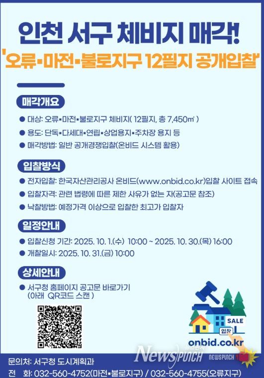 뉴스펀치 탁상훈 기자 | 인천 서구는 오는 10월 1일부터 30일까지 오류, 마전, 불로지구 토지구획정리사업구역 내 체비지 12필지를 일반 공개경쟁 입찰(전자입찰) 방식으로 매각한다고 밝혔다.