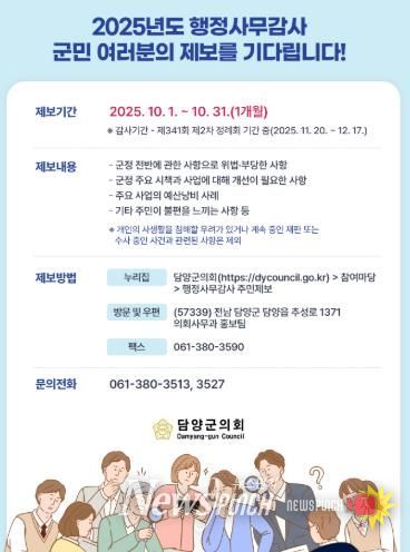 제보는 담양군의회 누리집, 이메일, 우편, 팩스 등 다양한 방법으로 제출할 수 있으며, 접수된 제보 내용은 실무 검토를 거쳐 오는 11월에 실시되는 제341회 제2차 정례회 기간 중 실시되는 행정사무감사에 적극 반영할 예정이다.
