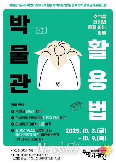 뉴스펀치 탁상훈 기자 | 부평구 부평역사박물관이 추석 연휴를 맞아 오는 3일부터 9일까지(6일 추석 당일 휴관) 특별전 연계 추석맞이 교육 프로그램 ‘박물관 활용법 : 추석을 전시와 함께 하는 방법’을 운영한다.