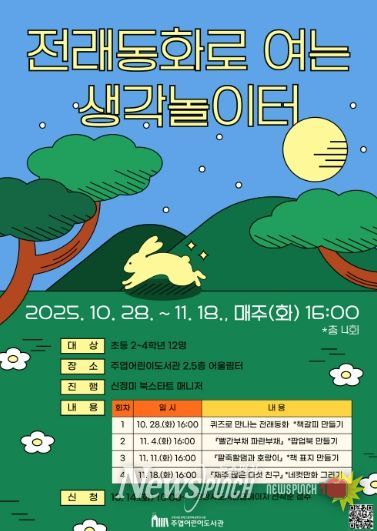 프로그램은 △1회차(10.28.) ‘퀴즈로 만나는 전래동화’와 책갈피 만들기 △2회차(11.4.) '빨간부채 파란부채'와 팝업북 만들기 △3회차(11.11.) '팥죽할멈과 호랑이'와 책 표지 만들기 △4회차(11.18.) '재주 많은 다섯 친구'와 네 컷 만화 그리기로 진행된다.