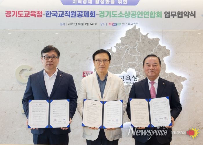 뉴스펀치 탁상훈 기자 | 경기도교육청이 1일 남부청사에서 경기도소상공인연합회, 한국교직원공제회와 ‘지역경제 활성화를 위한 상생 업무협약’을 체결했다.