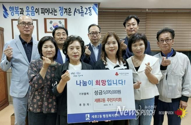 뉴스펀치 탁상훈 기자 | 수원시 권선구 세류2동 주민자치회는 지난 10월 1일, 추석 명절을 맞이하여 이웃돕기 성금 507만원을 세류2동 행정복지센터에 기부했다.